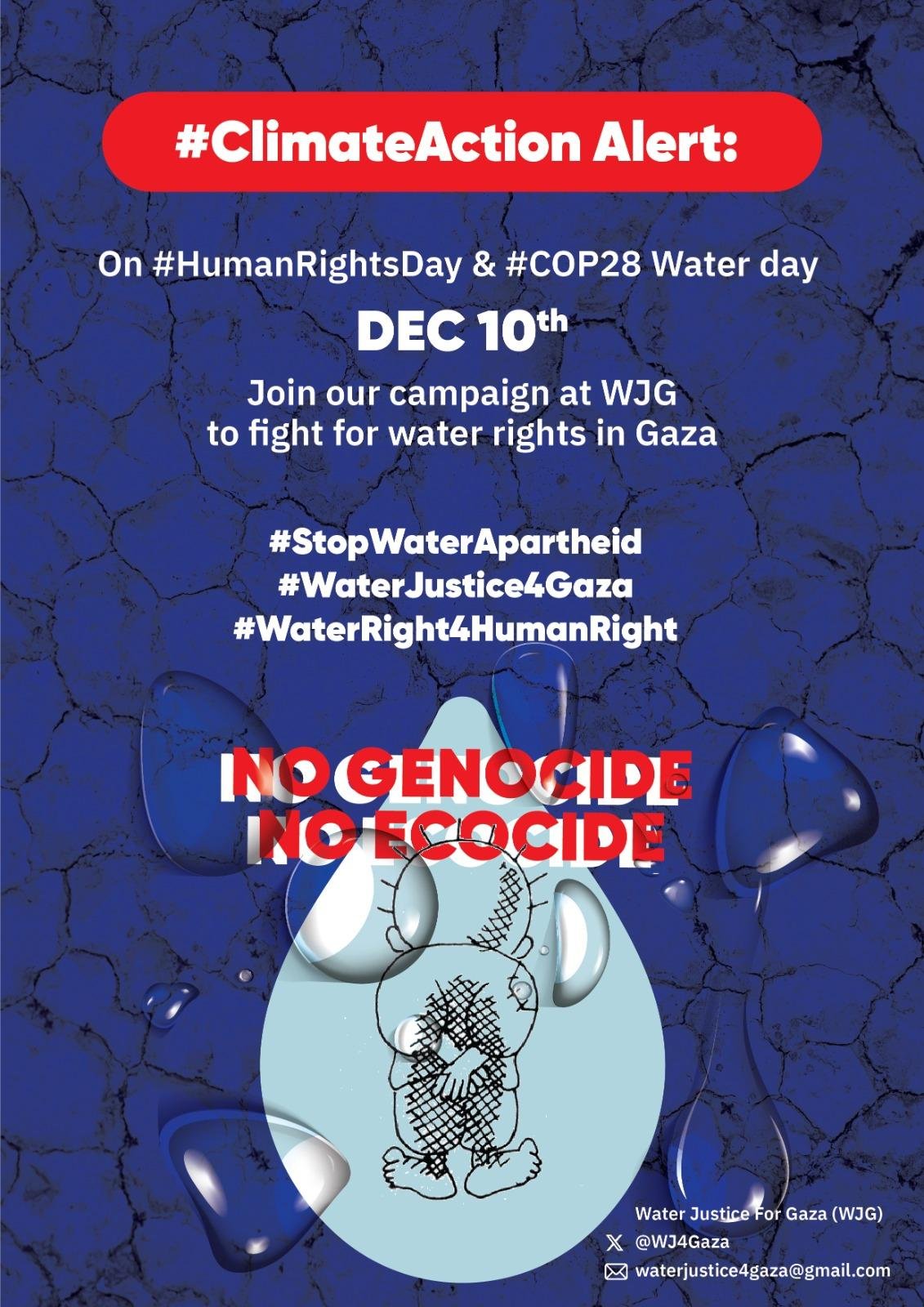 مع تزامن يوم الماء لمؤتمر المناخ COP28 مع اليوم العالمي لحقوق الإنسان في 10 ديسمبر 2023، يسعى تحالف WJG لدعمكم حملتنا حول تحقيق العدالة المائية في غزة والأراضي الفلسطينية ورفض الفصل العنصري والتمييز البيئي. مشاركتكم أساسية في ايصال رسالة ان العدالة المائية هي حق أصيل من حقوق الإنسان. ونرحب بدعمكم بأي شكل يتماشى مع قضيتنا، سواء كان ذلك من خلال الدعوة، أو التعليم، أو العمل المباشر.