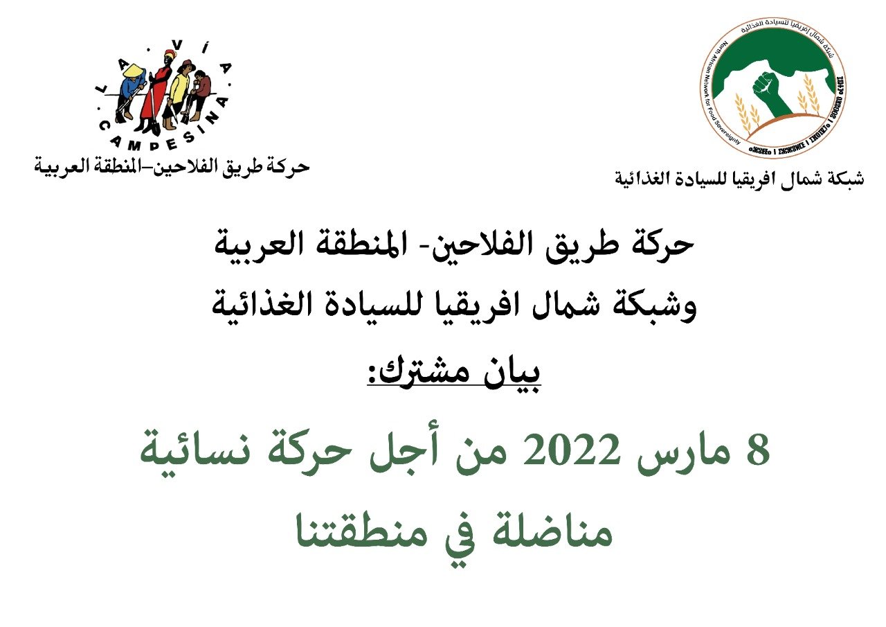وفي هذا اليوم نستذكر باعتزاز التاريخ الكفاحي للحركة النسائية في منطقتنا. ونؤكد في كل من شبكة شمال أفريقيا للسيادة الغذائية و حركة لافيا كمبيسينا في المنطقة العربية، أن تحرر مجتمعنا من الاضطهاد السياسي و الاقتصادي و الاجتماعي، رهين بتحرر النساء بقواهم الذاتية كتف بكف إلى جانب كل المضطهدين والمستغلين، في النضال ضد المجتمع الرأسمالي البطريركي الذي يديم الاستغلال و القهر.