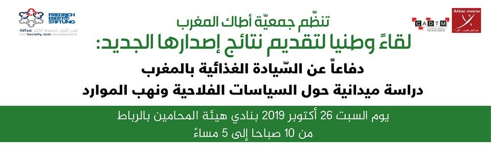 تنظم جمعية أطاك المغرب لقاء وطنيا في مدينة الرباط يوم 26 أكتوبر 2019 بمقر نادي المحامين من الساعة 10 صباحا الى 5 مساء، من أجل تقديم إصدارها الجديد تحت عنوان:” دفاعا عن السيادة الغذائية بالمغرب دراسة ميدانية حول السياسات الفلاحية ونهب الموارد“.