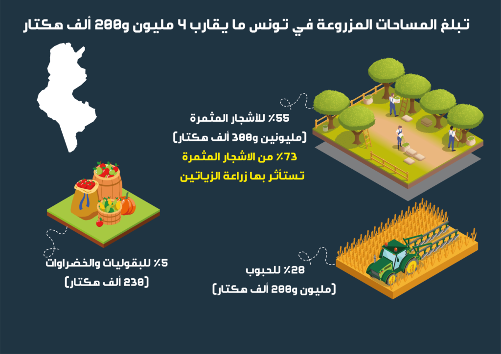 تبلغ المساحات المزروعة في تونس ما يقارب 4 مليون و200 ألف هكتار 2، تخصص منها ما يقارب 55% للأشجار المثمرة (مليونين و300 ألف هكتار) و28% للحبوب (مليون و200 ألف هكتار). أما البقوليات والخضراوات، فهي تشْغل سوى نسبة 5% (230 ألف هكتار). تستأثر زراعة الزياتين، من بين المساحات المخصصة للأشجار المثمرة، على مليون و700 ألف هكتار 3، أي ما يقارب 73% من المساحات المخصصة للأشجار المثمرة. هذه صورة أولية عن خارطة تونس الزراعية سنة 2018. لكن يمكننا كذلك أن نقرأ هاته الأرقام في سياقها الزمني. فإن ركّزنا بالخصوص على المساحات المخصصة للحبوب، نرى انخفاضها المطّرد منذ أواسط الثمانينات حتّى السنوات الأخيرة، من معدّلات فاقت المليون و500 ألف هكتار 4 إلى معدّل مليون و260 ألف هكتارا في العشرية الأخيرة، 5 أي بانخفاض بـنسبة 16%.